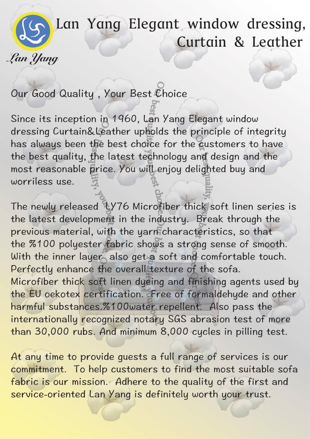 最新推出的LY76系列超纖細厚質柔軟細麻布,是業界最新一款的亞麻布,突破以往的材質,使用百分百聚酯纖維,利用紗線的特性,使布面呈現超強滑順感,另外,配合內層貼合,更可得到柔軟舒適的觸感,完美提升整體沙發的質感。超細纖維厚植柔軟細麻布所使用的染整藥劑通過歐盟oekotex認證,不含甲醛及其他對人體有害物質,防潑水效果達到百分之百,並且也通過國際知名第三方公正機構SGS的耐磨三萬轉以上測試,以及起毛毬測試至少8000次以上。