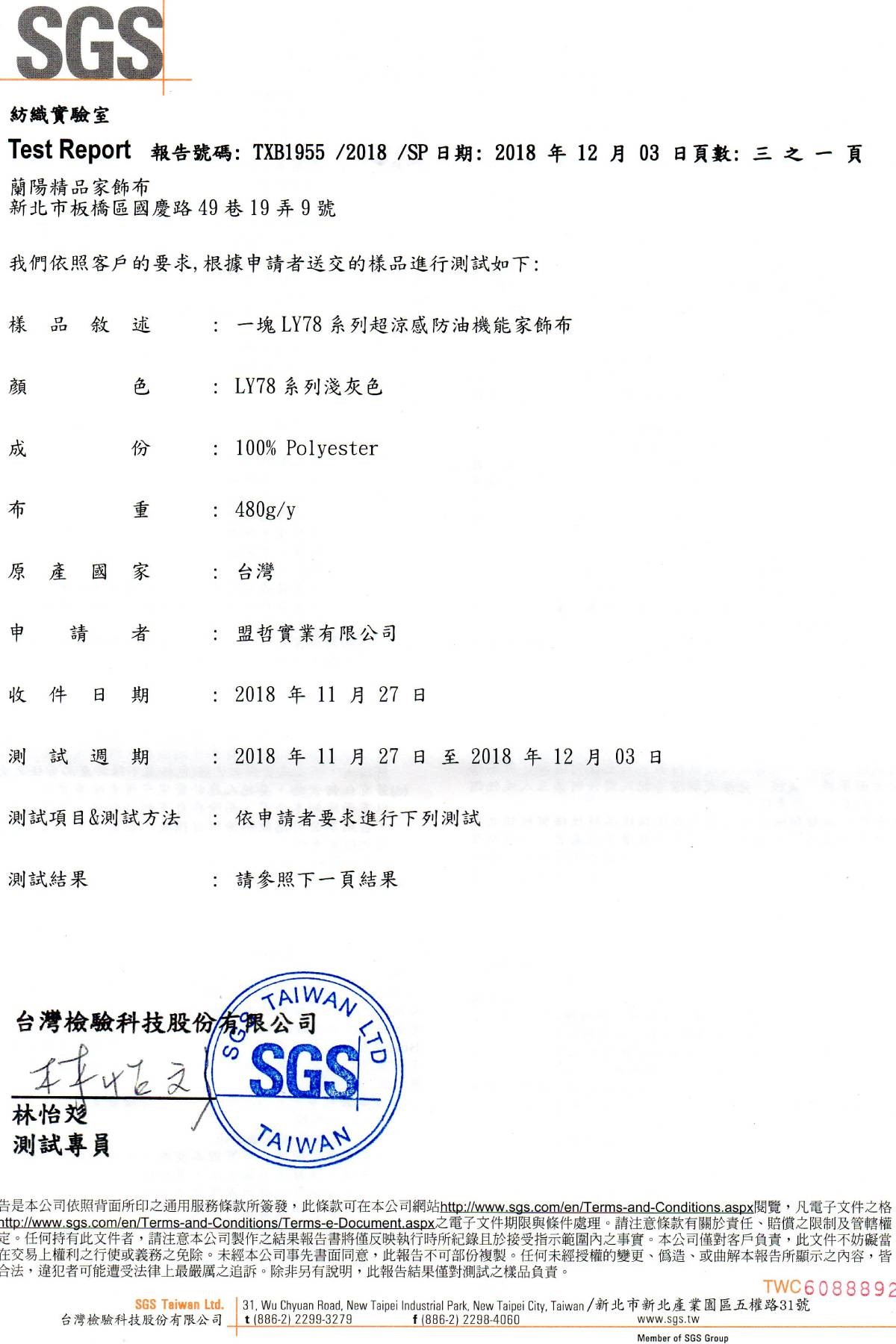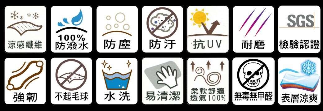 超涼感防油機能沙發布所使用的染整藥劑通過歐盟oekotex認證,不含甲醛及其他對人體有害物質,使用高科技環保型撥水,防潑水效果達到百分之百以上,同時亦通過國際知名公正機構SGS的瞬間涼感測試、耐磨(abrasion)三萬轉以上的測試,以及起毛毬(pilling)測試至少8000次以上。