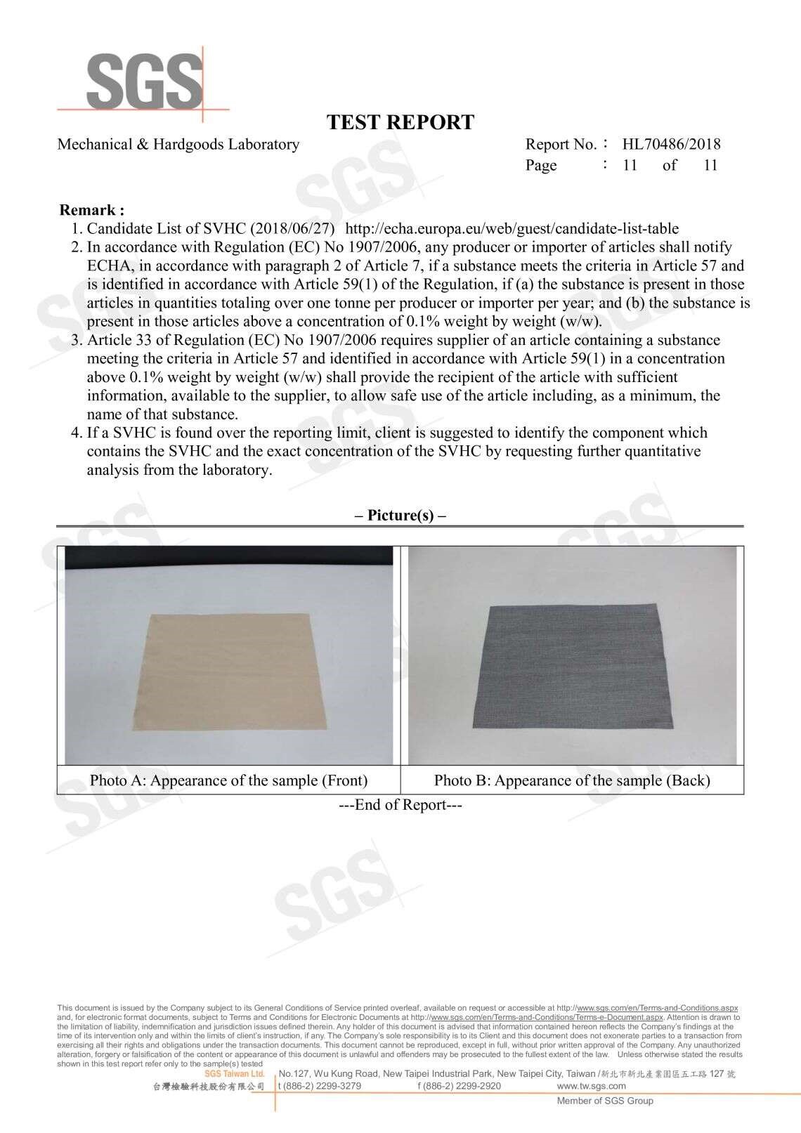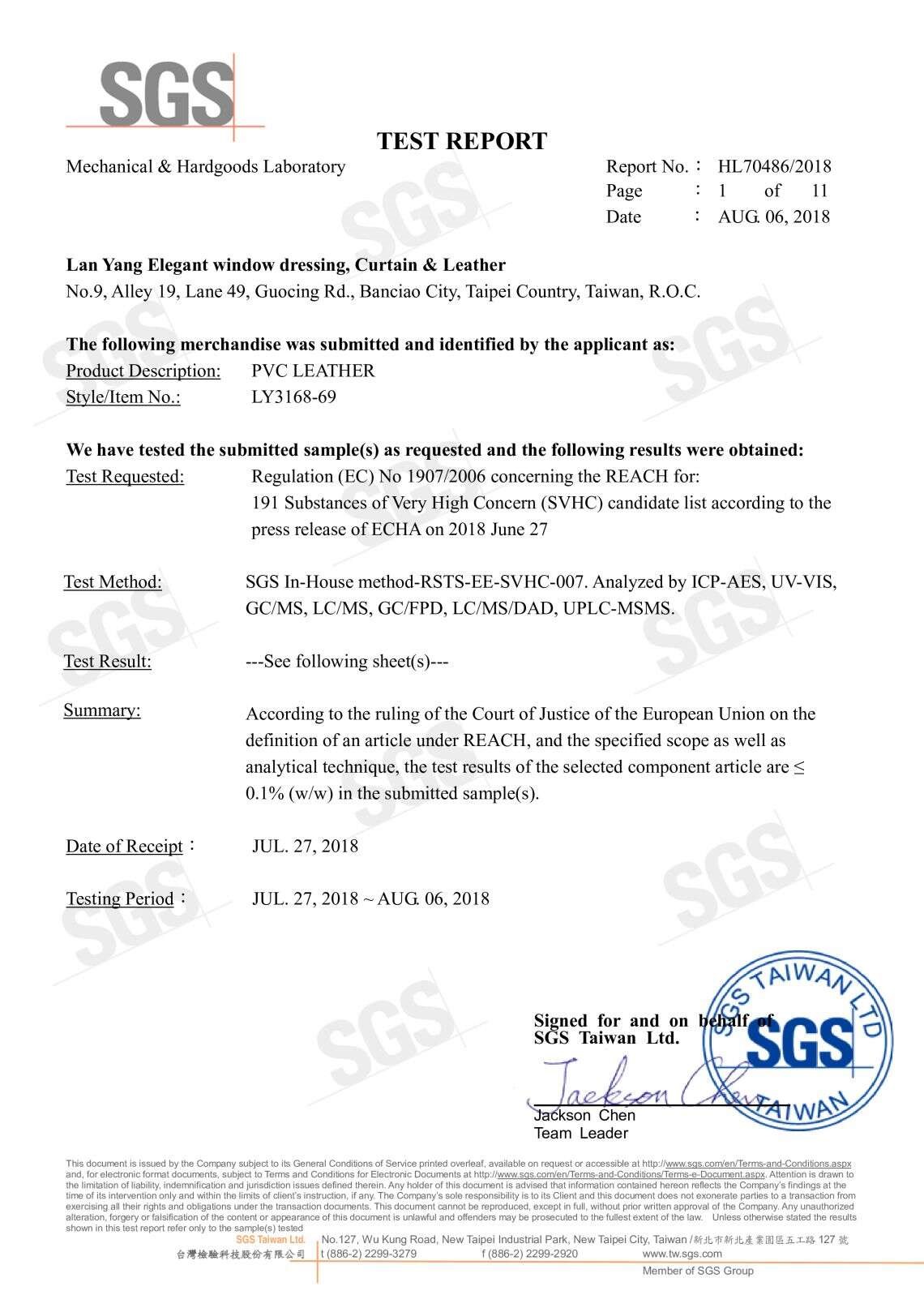 • LY奈米級耐磨布紋皮,基於歐洲化學品管理 高關注物質候選清單(依據歐盟第1907/2006號REACH法規)對191種高關注物質進行篩分社,根據具體的測試範圍和分析技術,樣品中測試的高關注物質濃度都低於0.1%(w/w)全部都通過。