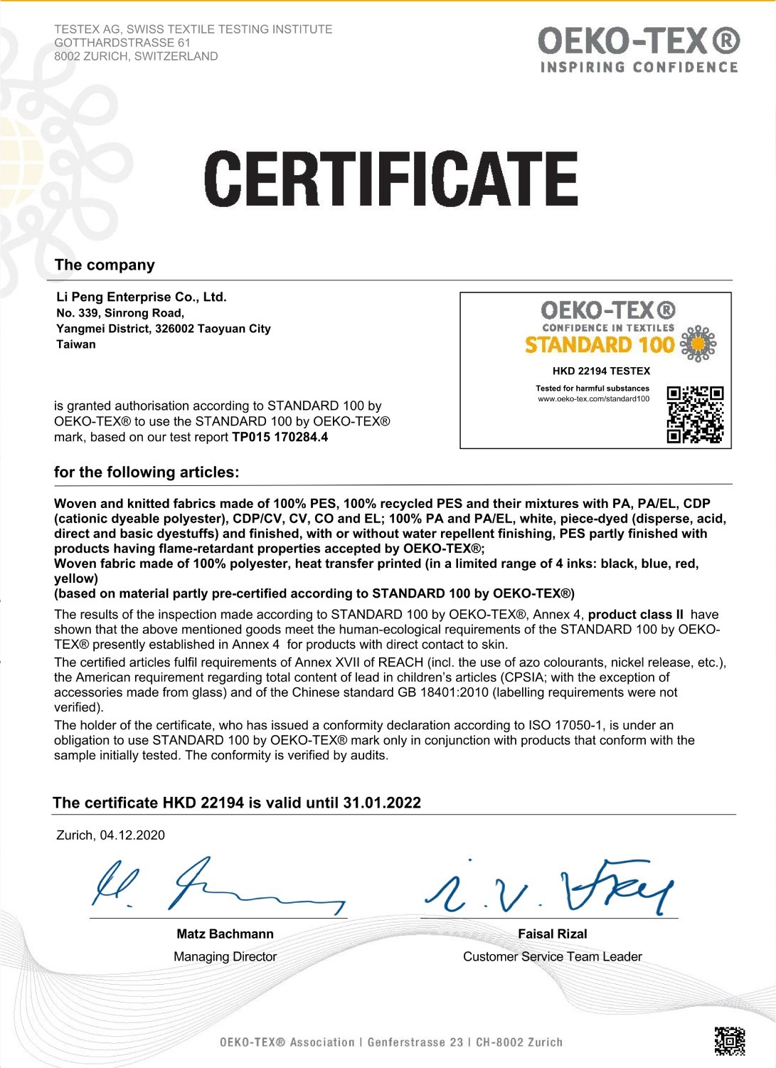 LY52 OEKO-TEX-Standard100認證